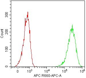 • Staining of Hela cell line cells using APC Anti-Human CD146 Antibody (Clone: P1H12) (Product No.: H1038) (green, red is blank control). Analyzed data are derived from live cells.