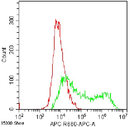 • Staining of fixed/permeabilized HEK-293F cells transfected with pEnCMV-CTLA4(human)-1-3×FLAG-SV40-Neo plasmid using APC Anti-Human CD152/CTLA-4 Antibody (Clone: BNI3) (Product No.: H1353) (green, red is blank control). Analyzed data are derived from total cells.