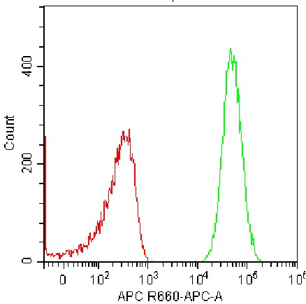 • Staining of U937 cell line cells using APC Human CD155/PVR Antibody (Clone: SKII.4) (Product No.: H1368) (Green, Red: Blank Control). Analyzed data are derived from total live cells.