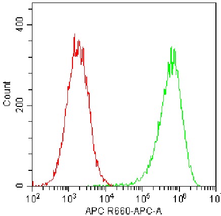 • Staining of HUVEC cell line cells using APC Human CD201/EPCR Antibody (Clone: RCR-401) (Product No.: H2778) (Green, Red: Blank Control). Analyzed data are derived from total live cells.