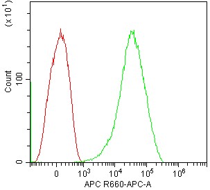 • Staining of normal human peripheral blood red blood cells using APC Anti-Human CD235a Antibody (Clone: GA-R2 (HIR2)) (Product No.: H1053) (green, red is blank control). Analyzed data are derived from total cells.