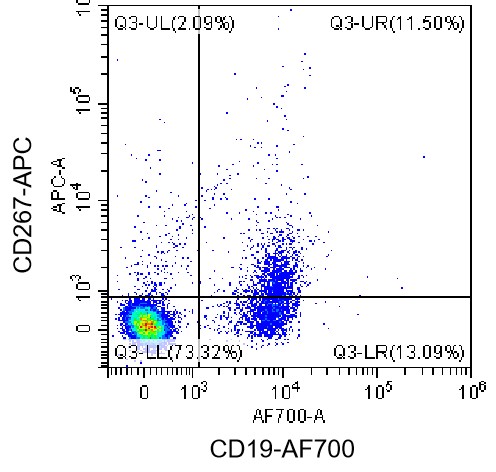 • Staining of normal human peripheral blood mononuclear cells (PBMCs) with APC anti-human CD267/TACI Antibody (Clone: 1A1) (Product Code: H2718) and AF700 anti-human CD19 Antibody. Analysis data derived from live lymphocytes.