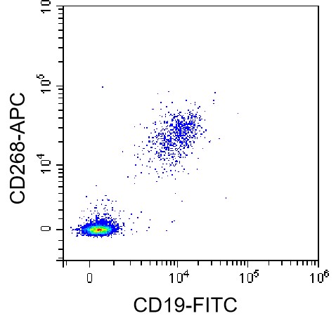 • Staining of normal human peripheral blood mononuclear cells (PBMCs) using FITC CD19 Antibody and APC Human CD268/BAFF-R Antibody (Clone: 11C1) (Catalog Number: H2163). Analysis data derived from lymphocytes.