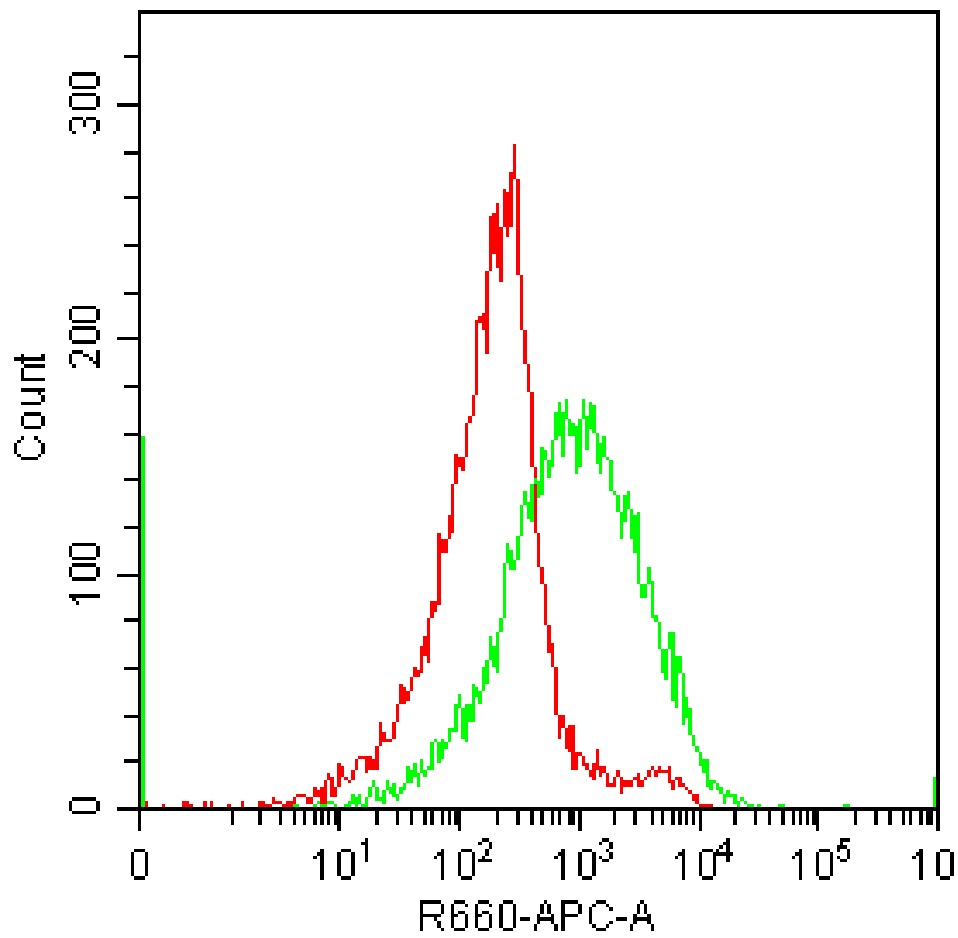 • Staining Raji cell line cells with APC Human CD275/B7-H2/ICOSL Antibody (Clone: 2D3) (Product Number: H2448) (green, red is unstained control). Analysis was performed on total live cells.