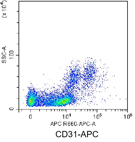 • Staining of normal human peripheral blood mononuclear cells (PBMCs) using APC Human CD31 Antibody (Clone: AC128) (Catalog Number: H0243). Analysis data derived from live cells.