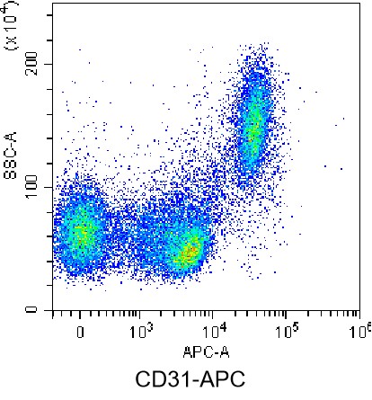 • Staining of normal human peripheral blood mononuclear cells (PBMCs) using APC Anti-Human CD31 Antibody (Clone: WM59) (Product No.: H0228). Analyzed data are derived from live cells.