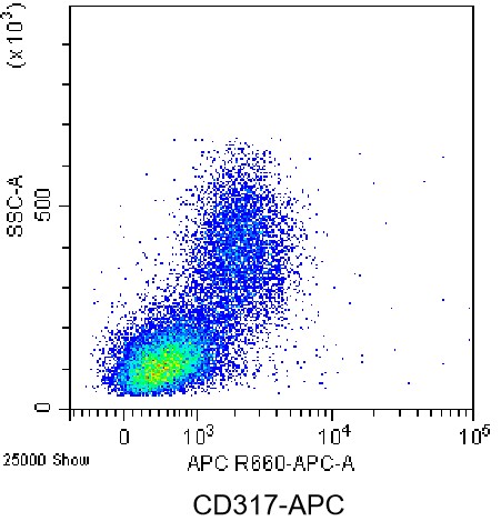 • Staining of normal human peripheral blood mononuclear cells (PBMCs) using APC Human CD317 Antibody (Clone: RS38E) (Selleck Cat#: H1638). Analyzed data are derived from total live cells.