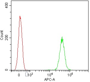 • Staining of normal human peripheral blood mononuclear cells (PBMCs) using APC Anti-Human CD33 Antibody (Clone: WM53) (Product No.: H0918) (green, red is blank control). Analyzed data are derived from monocytes.