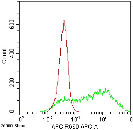 • Staining of fixed/permeabilized HEK-293F cell line cells transfected with pLV3-CMV-HAVCR2(human)-3×FLAG-Puro plasmid (green) using APC Human CD366 Antibody (Clone: F38-2E2) (Catalog Number: H3648) and blank control (red). Analysis data derived from total cells.