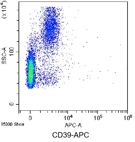 • Staining of normal human peripheral blood mononuclear cells (PBMCs) using APC Anti-Human CD39 Antibody (Clone: A1) (Product No.: H3378). Analyzed data are derived from total cells.