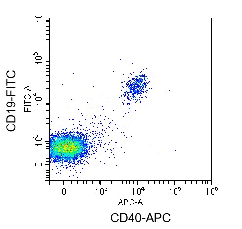 • Staining of normal human peripheral blood mononuclear cells (PBMCs) using FITC Anti-CD19 Antibody and APC Anti-Human CD40 Antibody (Clone: 5C3) (Product No.: H0558). Analyzed data are derived from lymphocytes.