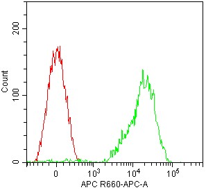 • Staining of platelets enriched from normal human peripheral blood using APC Anti-Human CD42b Antibody (Clone: HIP1) (Product No.: H4038) (Green, red is blank cells). Analyzed data are derived from lymphocytes.
