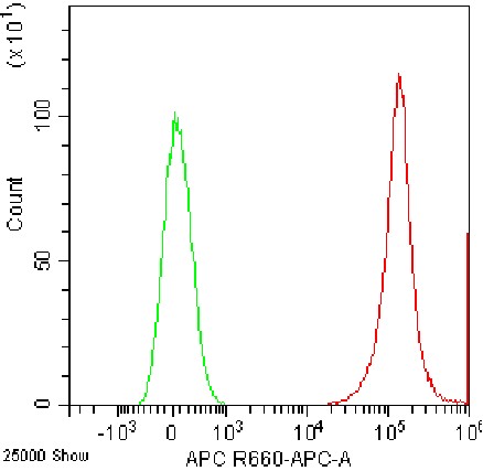 • Staining of normal human peripheral blood mononuclear cells (PBMCs) using APC Anti-Human CD45 Antibody (Clone: HI30) (Product No.: H0093) (red, green is unstained control). Analyzed data are derived from lymphocytes.