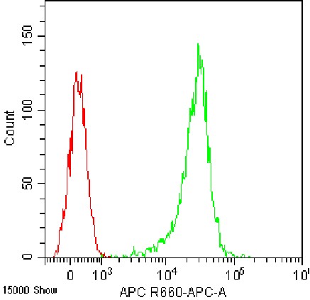• Staining of normal human peripheral blood mononuclear cells (PBMCs) using APC Anti-Human CD54 Antibody (Clone: HA58) (Product No.: H1248) (green, red is blank control). Analyzed data are derived from lymphocytes.