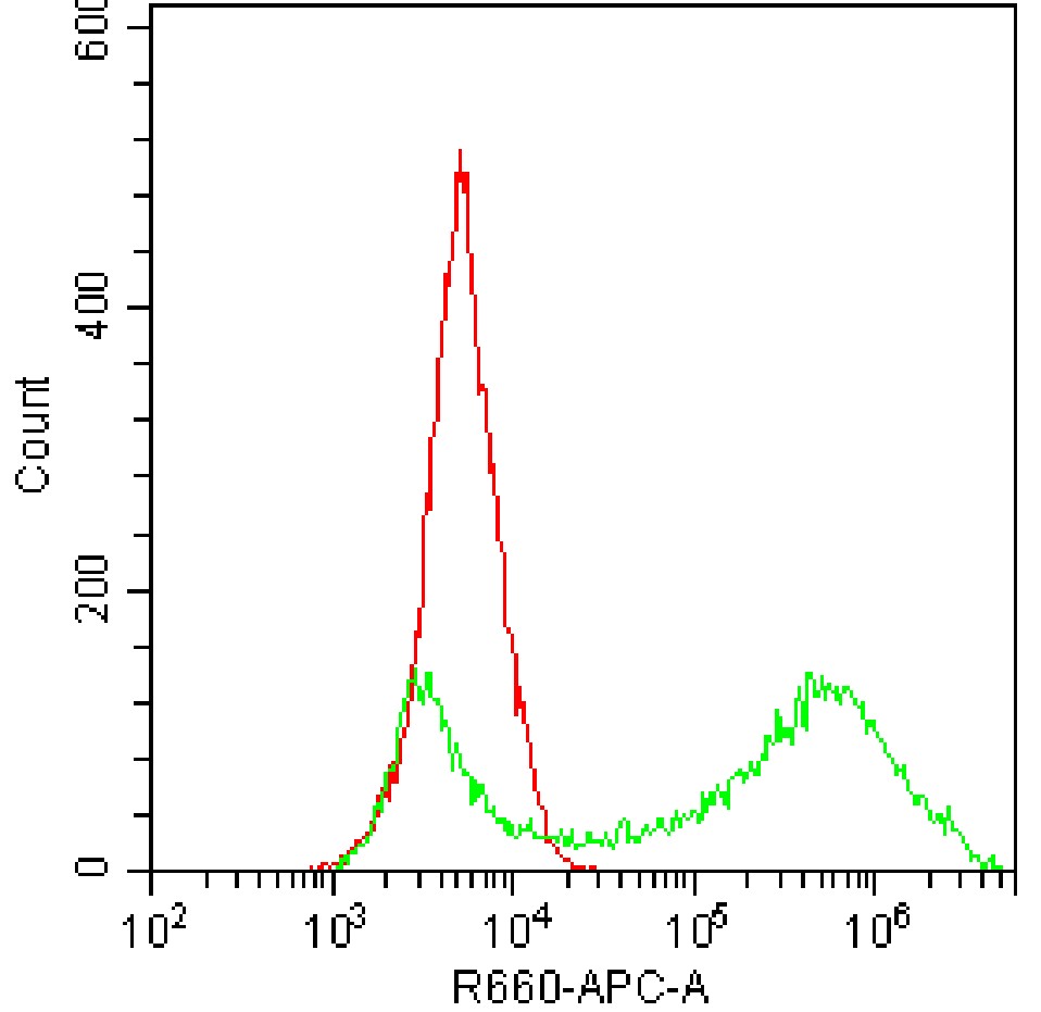 • Staining HEK-293F cells transfected with pCMV-SELE(human)-3×FLAG-Neo plasmid and fixed/permeabilized with fixation/permeabilization buffer with APC Human CD62E Antibody (Clone: 68-5H11) (Product Number: H2688) (green, red is unstained control). Analysis was performed on total cells.
