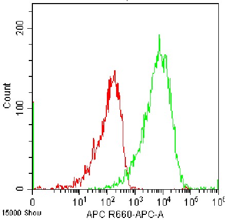 • Staining of platelet-enriched normal human peripheral blood using APC Anti-Human CD63 Antibody (Clone: H5C6) (Product No.: H1323) (green, red is blank control). Analyzed data are derived from lymphocytes.
