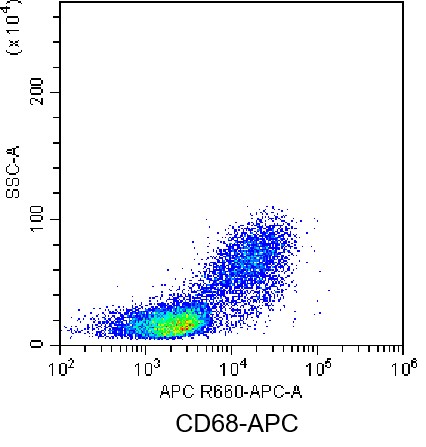 • Staining of fixed/permeabilized normal human peripheral blood mononuclear cells (PBMCs) using APC Anti-Human CD68 Antibody (Clone: Y1/82A) (Product No.: H0513). Analyzed data are derived from monocytes.
