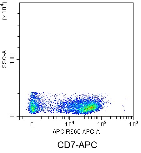 • Staining of normal human peripheral blood mononuclear cells (PBMCs) using APC Human CD7 Antibody (Clone: 124-1D1) (Catalog Number: H3993). Analysis data derived from lymphocytes.