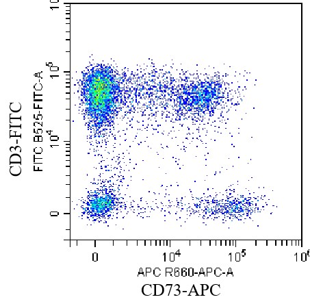 • Staining of normal human peripheral blood mononuclear cells (PBMCs) using FITC Anti-CD3 Antibody and APC Anti-Human CD73 Antibody (Clone: AD2) (Product No.: H0363). Analyzed data are derived from lymphocytes.