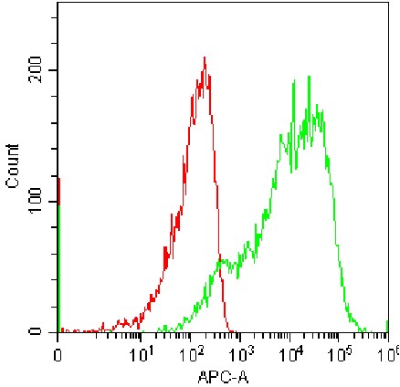 • Staining of normal human peripheral blood mononuclear cells (PBMCs) with APC anti-human CD82 Antibody (Clone: ASL-24) (Product Code: H3873) (green, red is unstained control). Analysis data derived from lymphocytes.