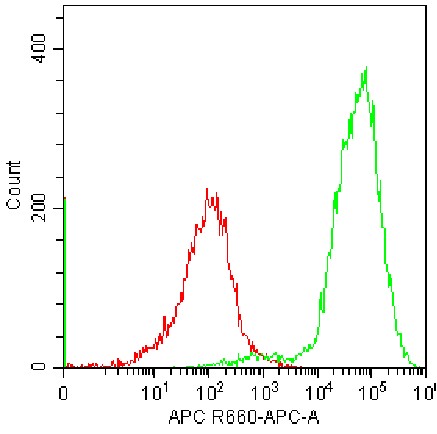 • Staining of normal human peripheral blood enriched platelets using Anti-Human CD9-APC (Clone: HI9a) (Product No.: H4023) (Green, Red: Blank Control). Analyzed data are derived from lymphocytes.