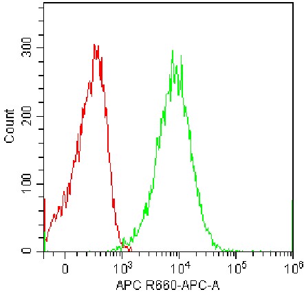 • Staining of normal human peripheral blood cells red blood cell-lysed using ammonium chloride lysis buffer using APC Human CEACAM-1/CD66a Antibody (Clone: 283340) (Product No.: H2178) (Green, Red: Blank Control). Analyzed data are derived from granulocytes.