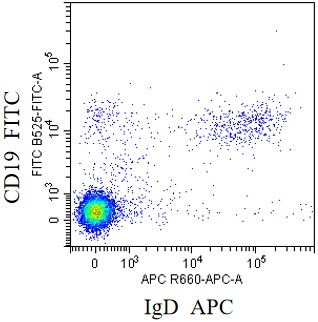 • Staining of normal human peripheral blood mononuclear cells (PBMCs) using FITC Anti-CD19 Antibody and APC Anti-Human IgD Antibody (Clone: IA6-2) (Product No.: H3693). Analyzed data are derived from lymphocytes.