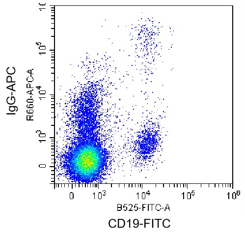 • Surface staining of normal human peripheral blood mononuclear cells (HPBMCs) with APC anti-human CD19 Antibody and APC anti-human IgG Antibody (Clone: G18-145) (Product Code: H3708). Analysis data derived from total live cells.