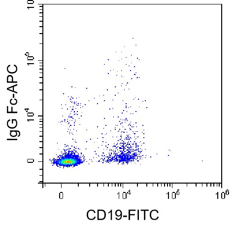 • Staining of normal human peripheral blood mononuclear cells (PBMCs) using FITC CD19 Antibody and APC Human IgG Fc Antibody (Clone: M1310G05) (Catalog Number: H2268). Analysis data derived from lymphocytes.