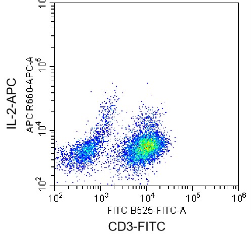 • Staining of fixed/permeabilized HEK-293F cells transfected with pLV3-CMV-IL2(human)-mCherry-Puro plasmid using FITC Anti-CD3 Antibody and APC Anti-Human IL-2 Antibody (Clone: MQ1-17H12) (Product No.: H1218). Analyzed data are derived from total cells.