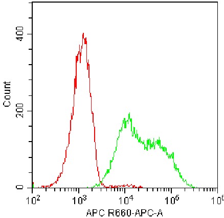 • Staining of fixed/permeabilized HEK-293F cells transfected with human IL-4 plasmid using APC Human IL-4 Antibody (Clone: MP4-25D2) (Product No.: H0423) (Green, Red: Blank Control). Analyzed data are derived from total cells.