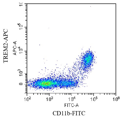 • Staining of healthy human peripheral blood mononuclear cells (PBMCs) with FITC anti-human CD11b Antibody and APC anti-human/mouse TREM2 Antibody (Clone: 237920) (Product Code: G3408). Analysis data derived from monocytes.