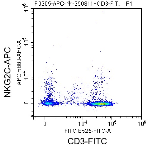 • Staining of normal human peripheral blood mononuclear cells (PBMCs) using FITC CD3 Antibody and APC Human NKG2C/CD159c Antibody (Clone: S19005E) (Catalog Number: H0903). Analysis data derived from lymphocytes.