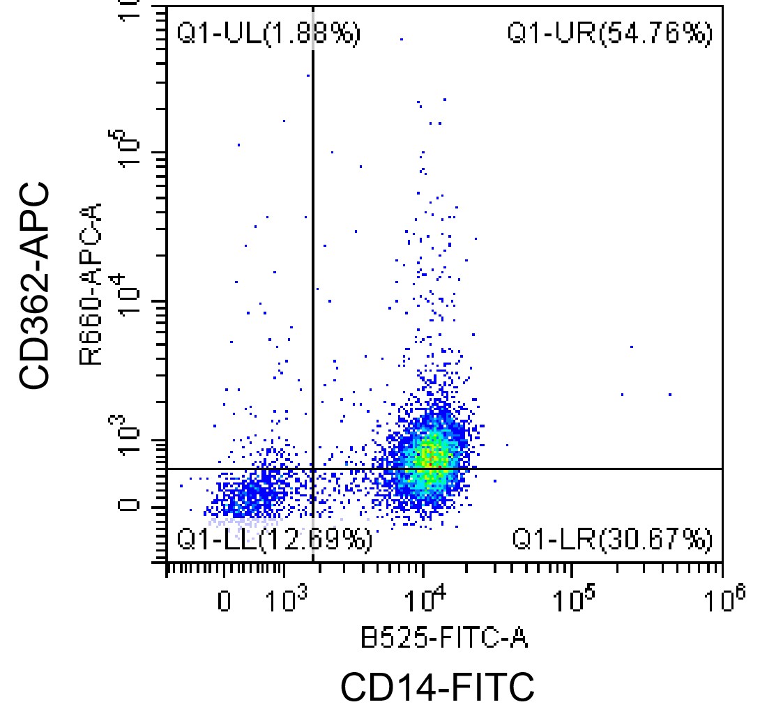 • Staining of normal human peripheral blood mononuclear cells (PBMCs) using APC Human Syndecan-2/CD362 Antibody [305515] (Selleck Cat.: H4488) and CD14-FITC. Analyzed data are derived from monocytes.