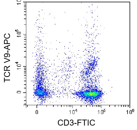 • Staining of normal human peripheral blood mononuclear cells (PBMCs) using FITC CD3 Antibody and APC Human TCR Vγ9 Antibody (Clone: 3G8.5) (Catalog Number: H2493). Analysis data derived from lymphocytes.