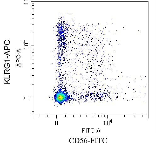 • Staining of normal human peripheral blood mononuclear cells (PBMCs) with APC anti-human KLRG1 Antibody (Clone: 13F12F2) (Product Code: H3723) and FITC anti-human CD56 Antibody. Analysis data derived from live lymphocytes.