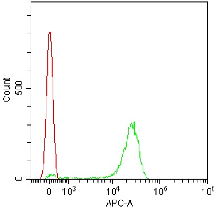 • Staining of C57B/6 thymocytes with APC anti-mouse CCR9 Antibody (Clone: 242503) (Product Code: G1443) (green, red is unstained control). Analysis data derived from total live cells.