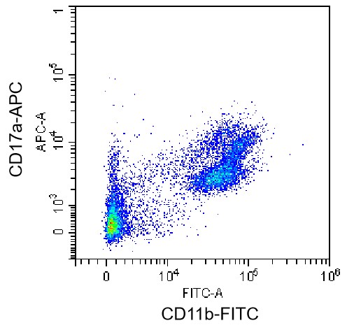 • Staining of C57BL/6 mouse bone marrow cells with FITC anti-mouse CD11b Antibody and APC anti-mouse CD172a/SIRPα Antibody (Clone: P84) (Product Code: G3003). Analysis data derived from live lymphocytes.