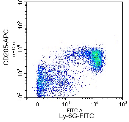 • Staining of C57BL/6 mouse bone marrow cells with FITC anti-mouse Ly-6G Antibody and APC anti-mouse CD205/DEC-205 Antibody (Clone: NLDC-145) (Product Code: G1548). Analysis data derived from live bone marrow cells.