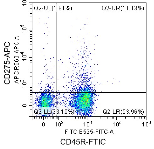 • Staining of normal human peripheral blood mononuclear cells (HPBMCs) stimulated with 1μg/mL LPS for one day using APC mouse CD275 Antibody (Clone: HK5.3) (Selleck Cat#: G4908) and FITC CD45R Antibody. Analyzed data are derived from total live cells.