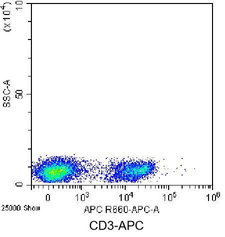 • Staining of C57BL/6 mouse splenic lymphocytes using APC Mouse CD3 Antibody (Clone: 17A2) (Catalog Number: G4638). Analysis data derived from live lymphocytes.