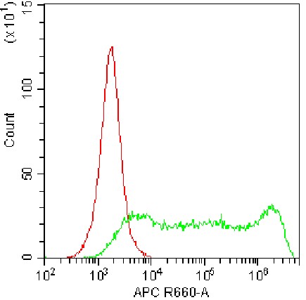 • Staining of permeabilized HEK-293F cells transfected with pLV3-CMV-Mgl2(mouse)-3×FLAG-CopGFP-Puro plasmid using fixation/permeabilization buffer with APC anti-mouse CD301b/MGL2 Antibody (Clone: URA-1) (Product Code: G2238) (green, red is unstained control). Analysis data derived from total cells.