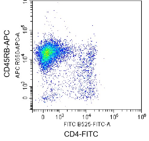 • Staining of splenic lymphocytes from C57BL/6 mice using APC Mouse CD45RB Antibody (Clone: C363.16A) (Selleck Cat#: G1653) and FITC CD4 Antibody. Analyzed data are derived from total live cells.