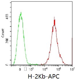 • Staining of splenic lymphocytes from C57BL/8 mice using APC Anti-Mouse H-2Kb Antibody (Clone: AF6-88.5) (Product No.: G1803) (red, green is blank control). Analyzed data are derived from live lymphocytes.