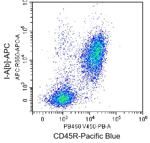 • Staining of C57BL/6 mouse splenic lymphocytes using PB CD45R Antibody and APC Mouse I-A[b] Antibody (Clone: AF6-120.1) (Catalog Number: G1503). Analysis data derived from live lymphocytes.