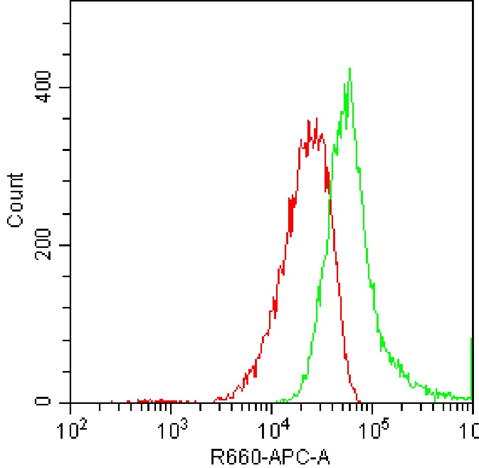 • Staining HEK-293F cells transfected with mouse IFN-γ plasmid and fixed/permeabilized with fixation/permeabilization buffer with APC Mouse IFNγ Antibody (Clone: R4-6A2) (Product Number: G4173) (green, red is unstained control). Analysis was performed on total cells.