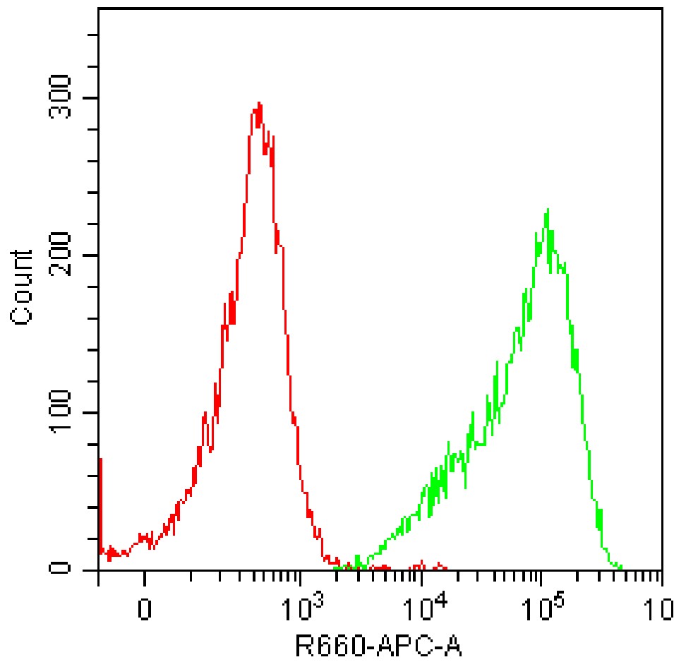 • Staining Neuro-2A cells with APC Mouse NCAM-1/CD56 Antibody (Clone: 809220) (Product Number: G0678) (green, red is unstained control). Analysis was performed on total cells.