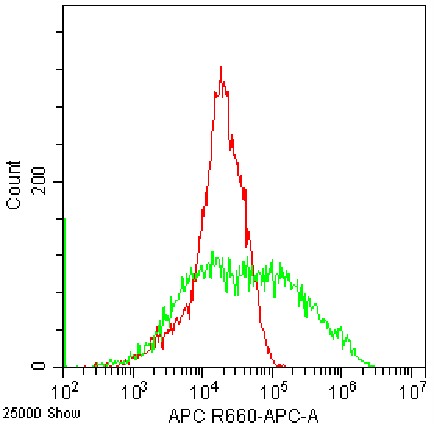 • Staining of fixed/permeabilized HEK-293F cell line cells transfected with pCMV-TIGIT(mouse)-SV40-Neo plasmid (green) using APC mouse TIGIT Antibody (Clone: 1G9) (Catalog Number: G4893) and blank control (red). Analysis data derived from total cells.