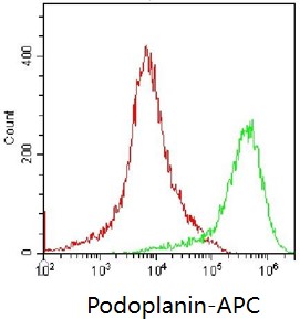 • Staining of TE-73 cell line cells using APC Anti-Podoplanin Antibody (Clone: L7B2) (Product No.: G1293) (green, red is blank control). Analyzed data are derived from live cells.