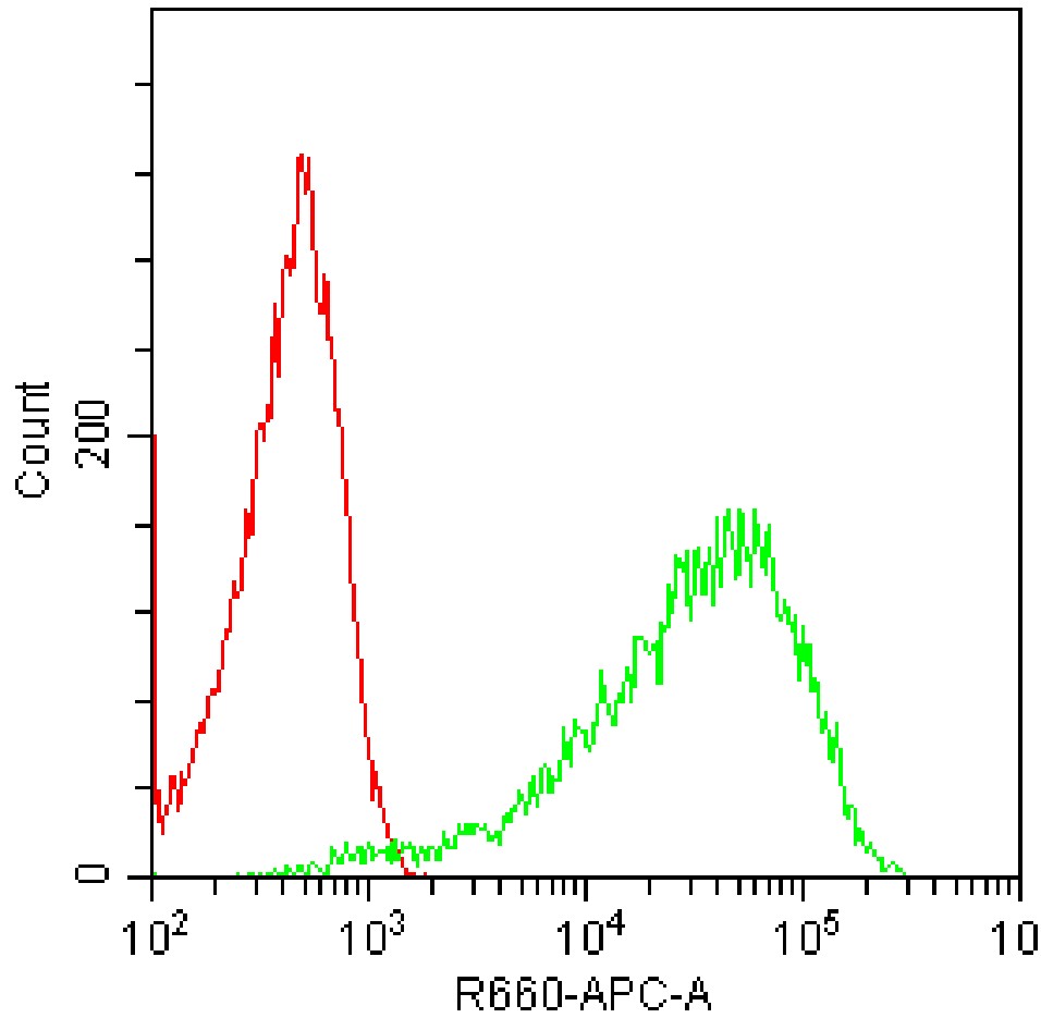 • Staining of U87 cell line cells using APC Podoplanin Antibody (Clone: NZ-1.3) (Product No.: G1278) (green, with red blank control). Analyzed data are derived from total cells.